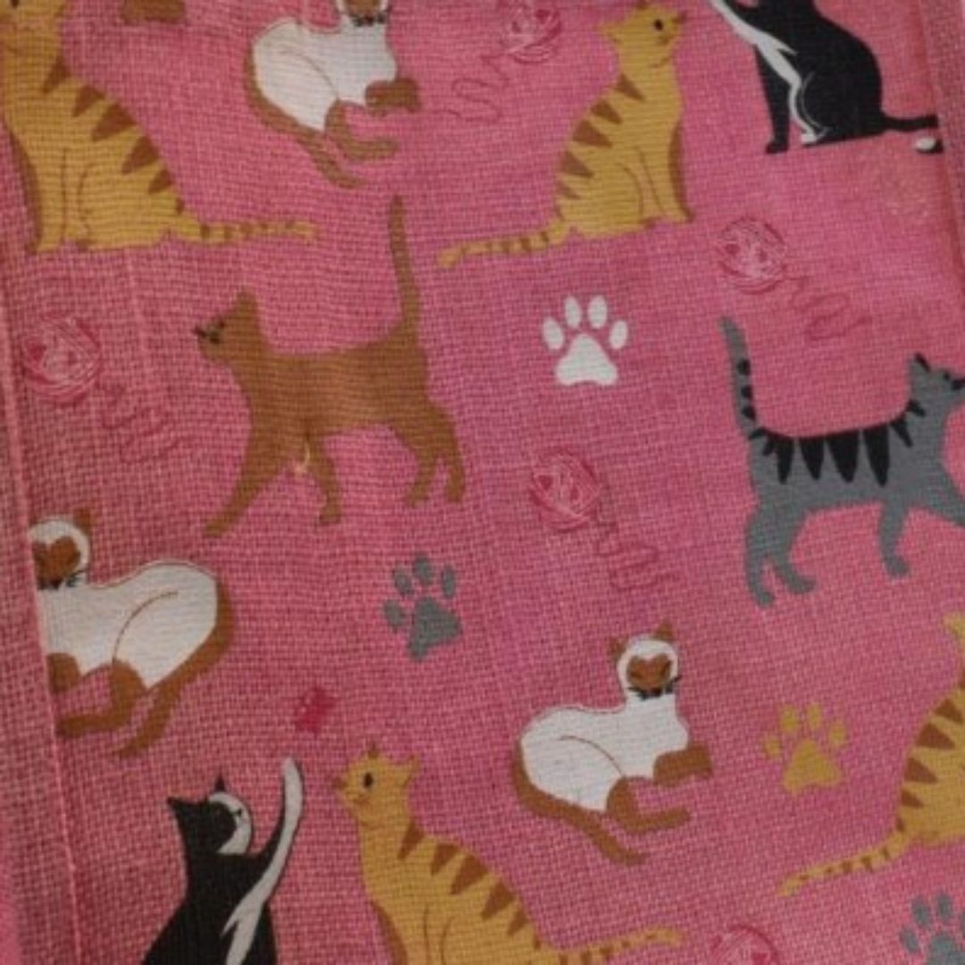 A very handy and roomy jute shopping bag. Bright pink with all kinds of cats from ginger to Siamese. This jute shopper has been screen printed by hand in Kolkata, India.