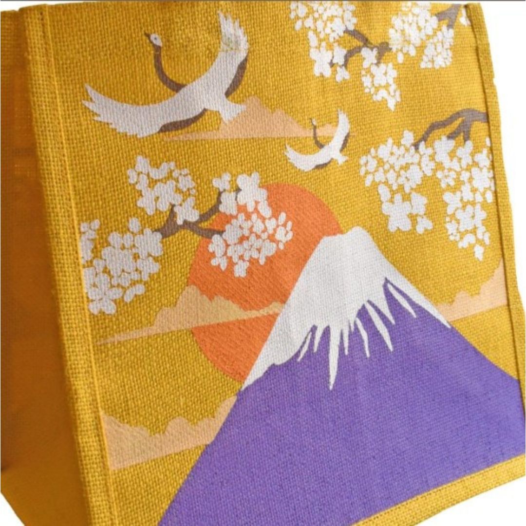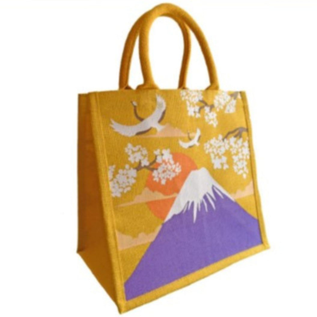 Style up your shopping trips with this classic Japanese scene of cranes flying across Mount Fuji, in vibrant yellow and purple. This jute eco shopper has been hand-screen printed in Kolkata, India.