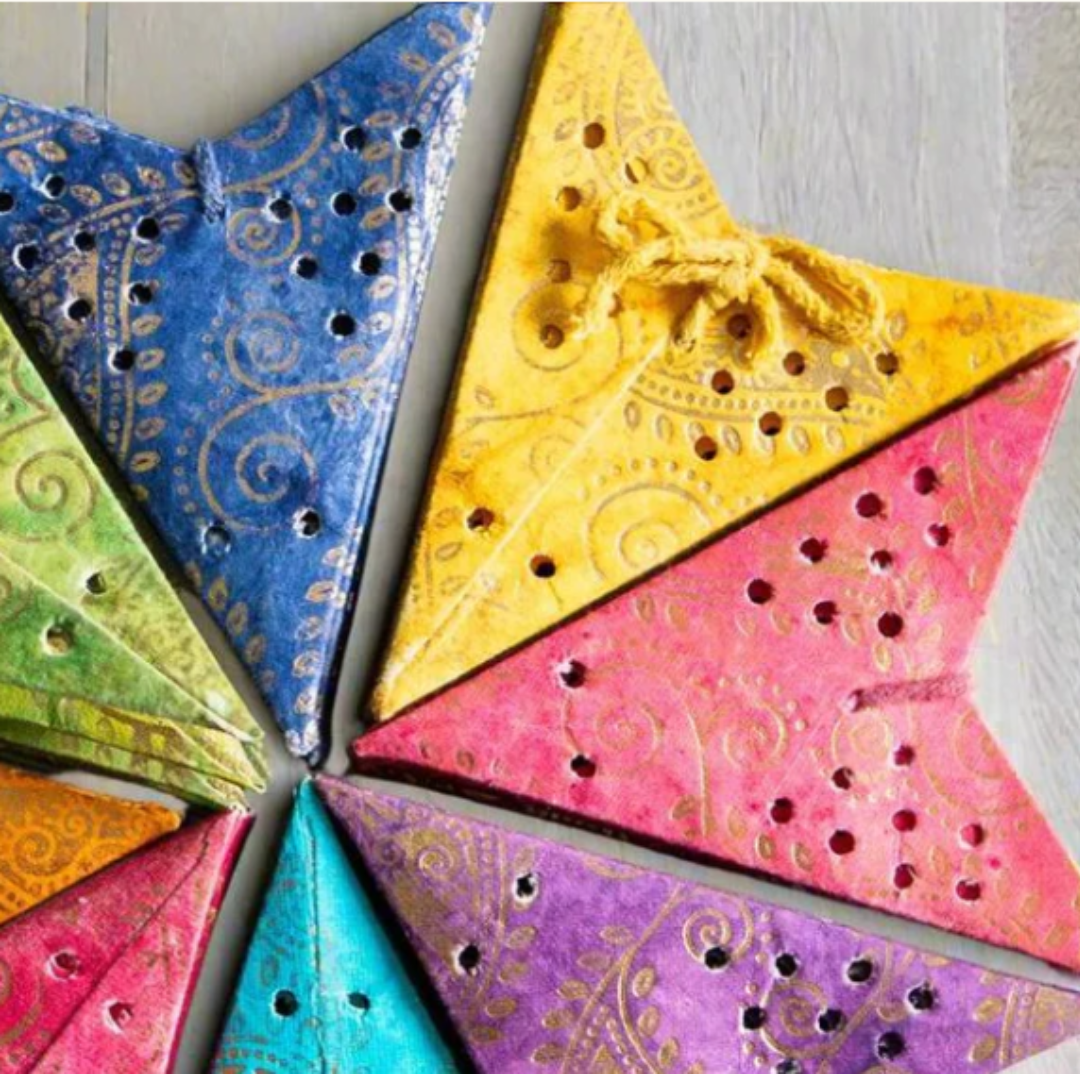 Crafted in India these paper rainbow decorative stars are created using recycled cotton waste and paper making techniques. Each star opens to reveal a gold tear dropped motif - perfect for parties and seasonal decor. They can be used on there own or combined with a string of LED lights.