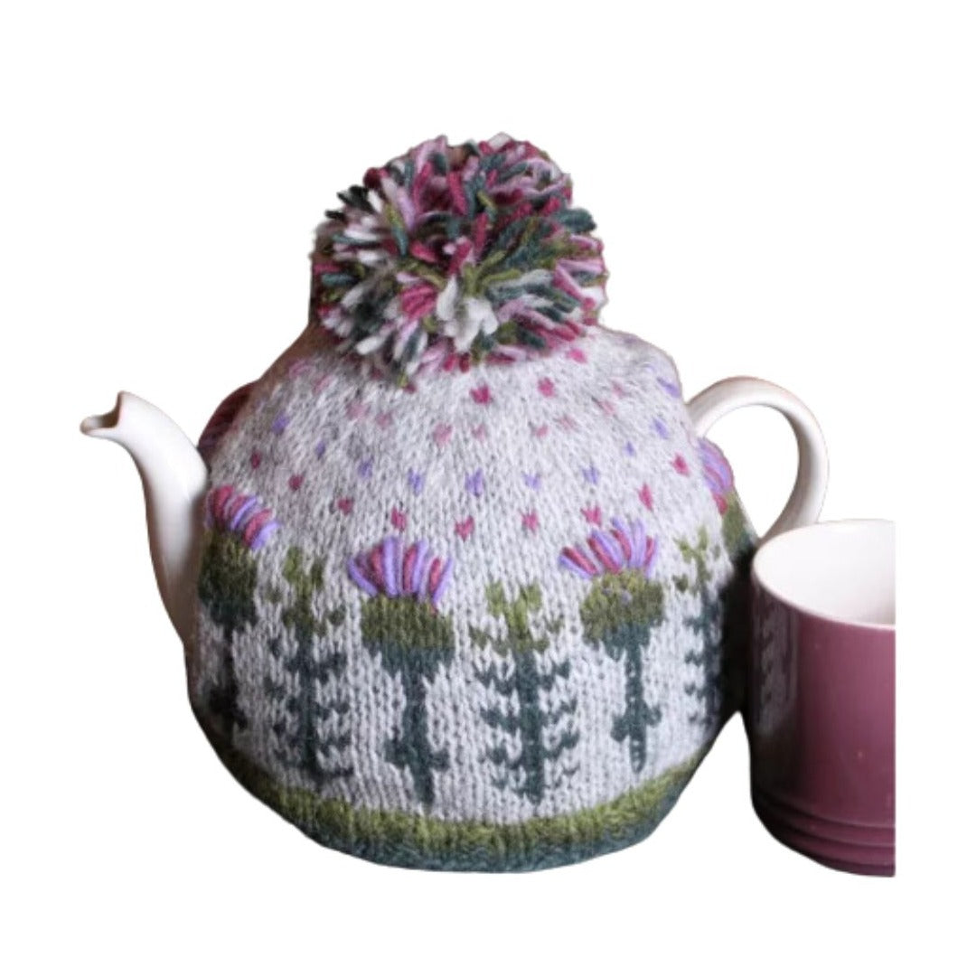 This thick-knit wool teapot cover features carefully hand embroidered purple flowers against a grey and green background. This fleece lined cosy is a perfect gift for tea lovers, keeping your tea extra hot.